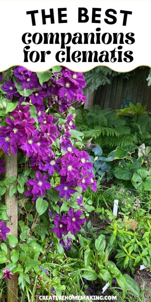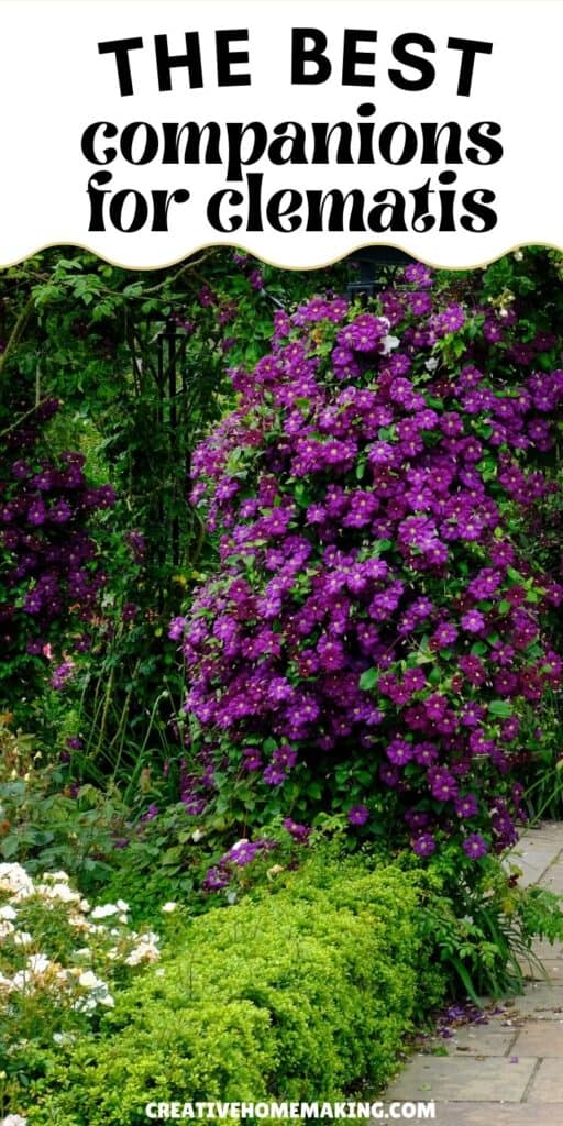 Other good options include campanula and peonies. They don’t grow too tall and won’t block your clematis flowers. All these provide variety in shape and height while keeping the focus on your clematis.