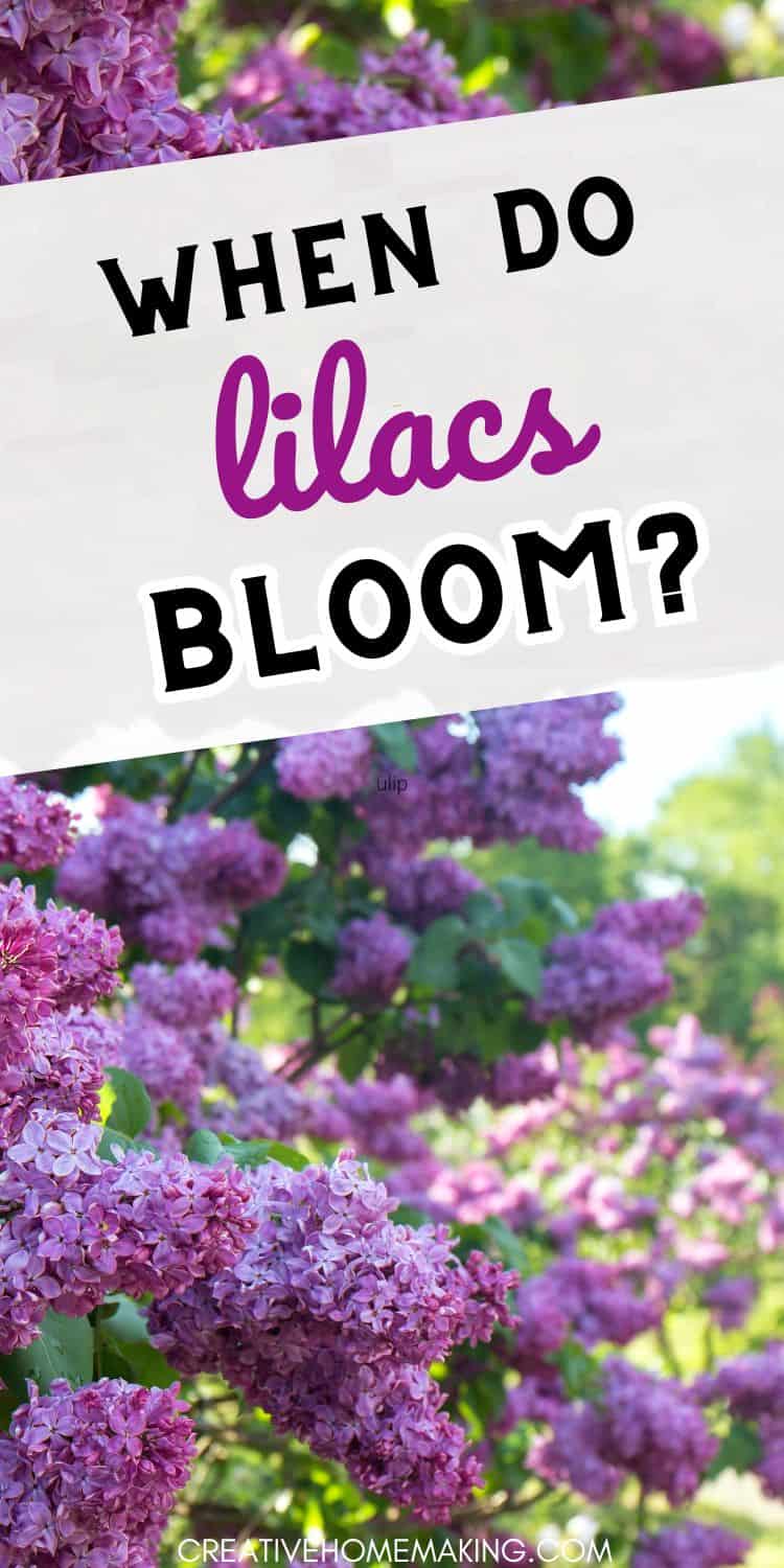 Lilacs typically bloom in late spring to early summer, depending on the specific variety and your location. Flower buds will start to form in the fall, and then go dormant during the winter months.