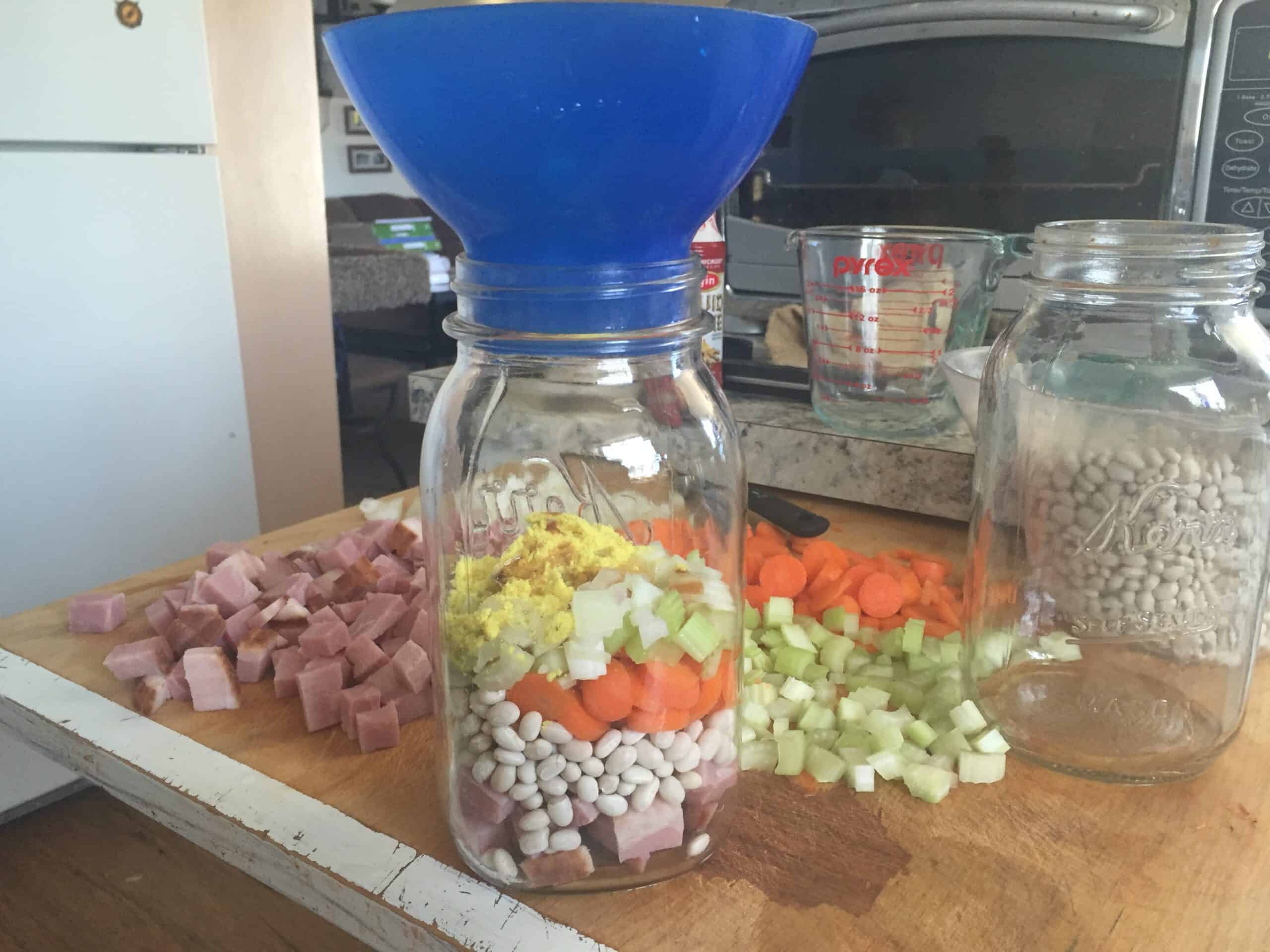 Rinse the beans. Place 3/4 c. dried beans in each jar. Add ham, chopped onion, chopped carrots, celery, chicken bouillon, and salt to each jar.