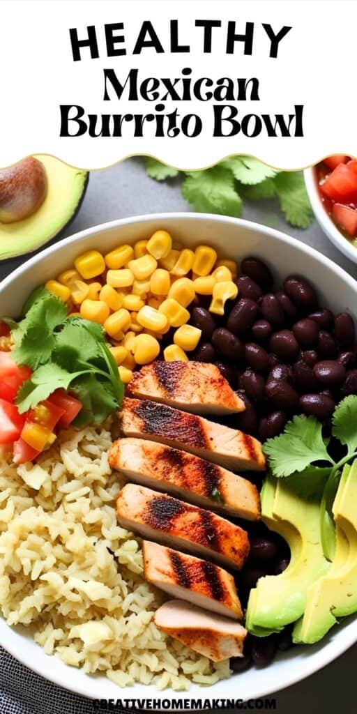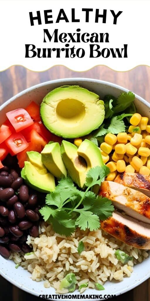Finish with optional toppings like shredded cheese or a dollop of sour cream or Greek yogurt for extra creaminess. Enjoy your flavorful and healthy Mexican burrito bowl!